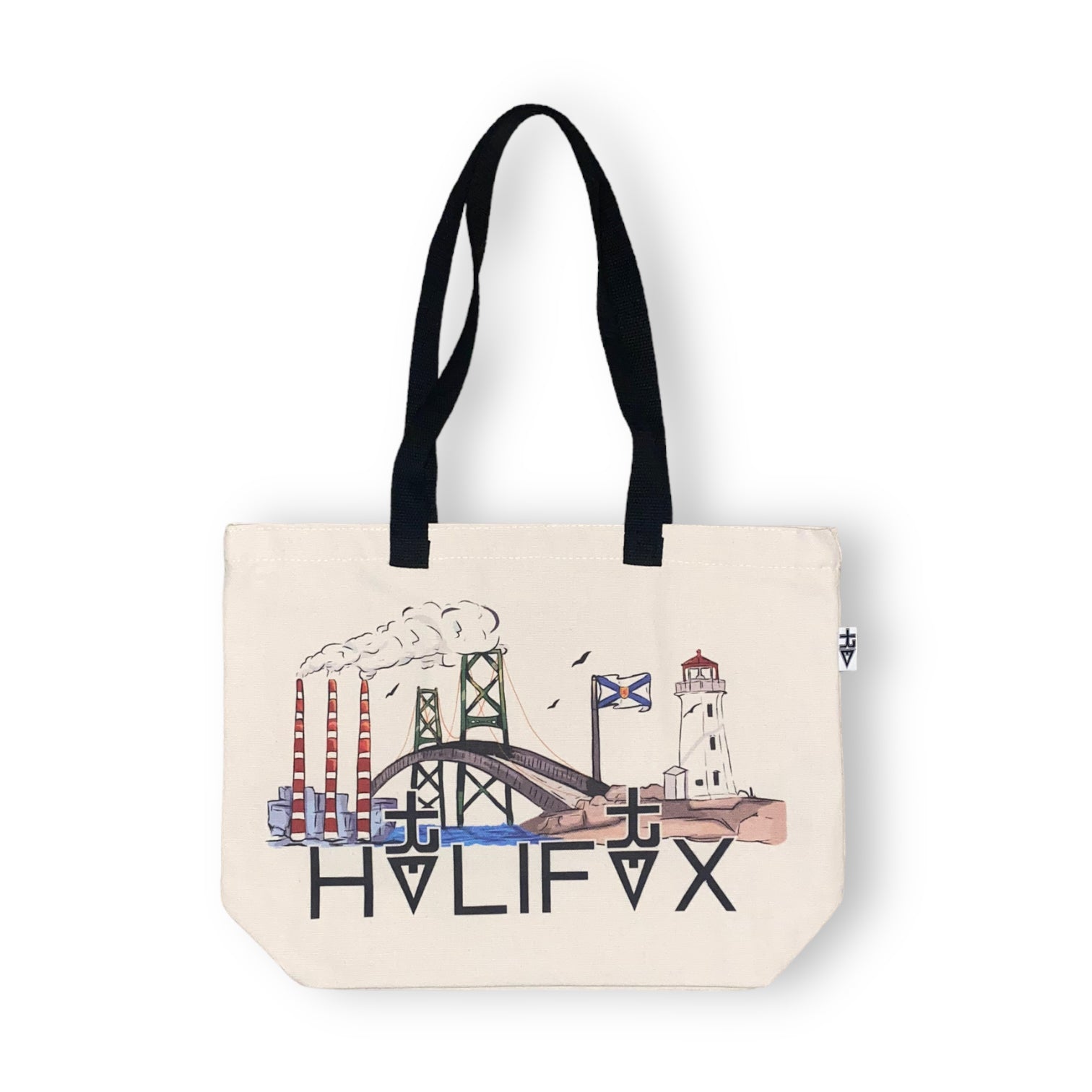 Depicted Landmarks: The bag showcases iconic elements of Halifax including the MacDonald/MacKay Bridge, Dartmouth Smokestacks, Peggy's Cove Lighthouse, and the Nova Scotia Flag.